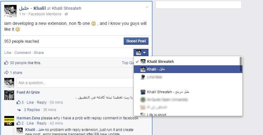 One of Facebook last year updates allows users to choose one of their pages usernames to leave a comment with, They replaced the old style where we was able to change from our page username to our account username from the top of the page . As you see in the above picture i have different usernames i can choose between to leave a comment on my page post or any other facebook page post .