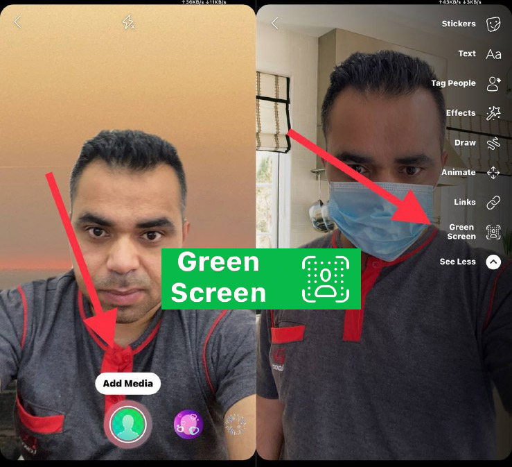 في حين انه يمكنك استخدام الشاشة الخضراء ايضا عن طريق تطبيق الفلتر لحظة انشاء قصة وبدأ التصوير وذلك من خلال اختيار الفلتر المخصص لذلك، كما تظهر الصورة في الاعلى الجانب الايسر